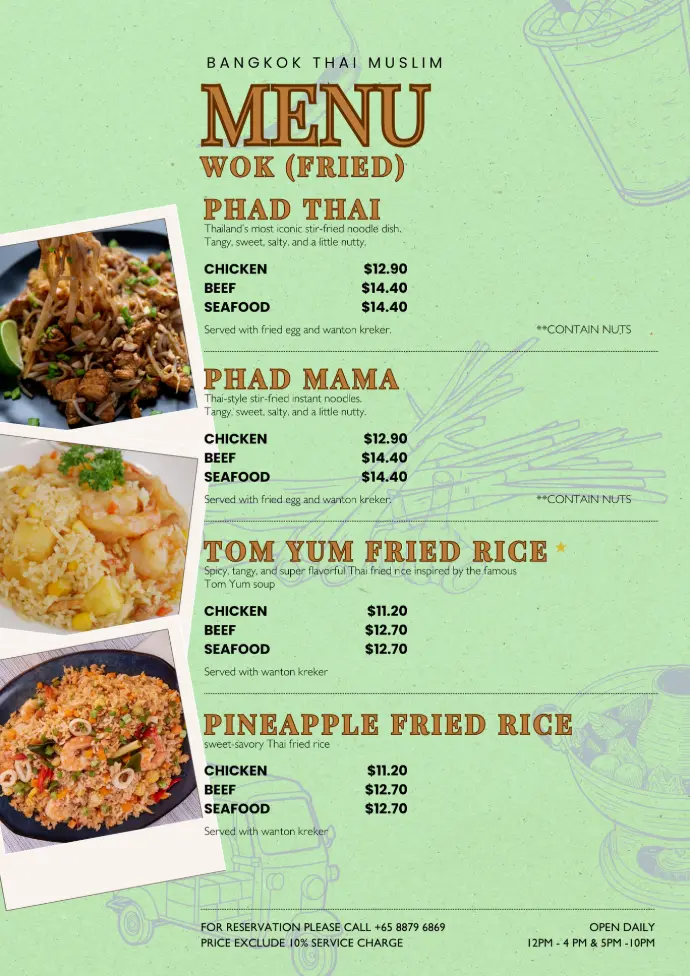 At Bangkok Thai Muslim Food, we strive to preserve the authenticity of traditional Thai cuisine. However, to better suit local preferences, we have thoughtfully adjusted elements such as spiciness, sourness, and sweetness to align with the Singaporean palate, all while staying true to the essence of each dish. Our goal is to offer a balanced, enjoyable experience that honours Thai culinary heritage while being warmly welcomed by our diverse local diners.